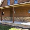 We built a curved stone wall that grew as the elevation dropped while circling on the driveway which gave the home a level table top setting. My client and I shared a mutual love for an old style mix of wood and stone which we both enjoyed implementing inside and out on this unique country home.